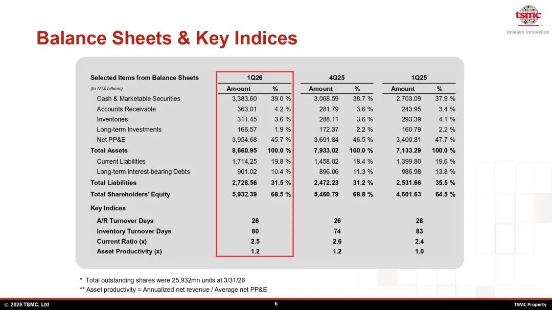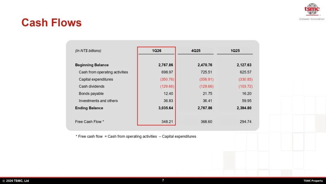 黄仁昭补充,首季存货天数升至80天,较前一季增加六天,主要反映2纳米制程进入拉升阶段,以及3纳米需求持续强劲;单季营运现金流入约6,990亿元,资本支出约3,510亿元(约111亿美元),显示公司仍持续加大投资力道,支应先进制程与高阶需求成长。