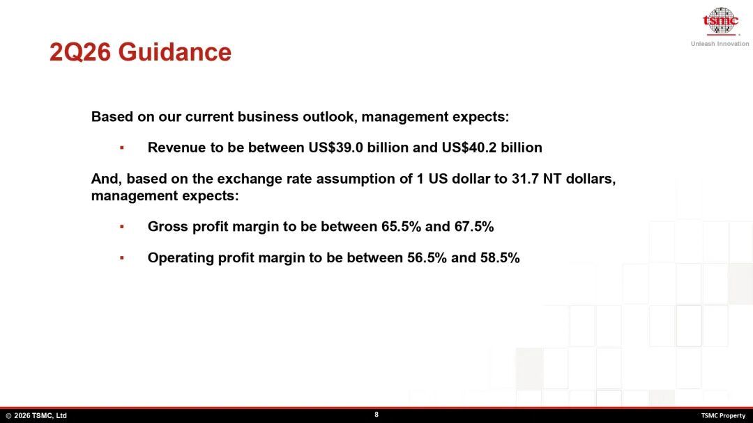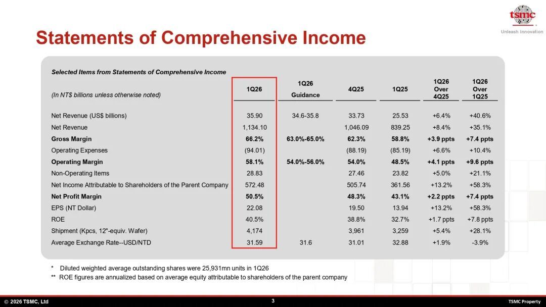 台积电财务长黄仁昭指出,首季毛利率走升,主要受惠于成本改善、产能利用率提升,以及较有利的汇率条件;营益率同步上扬,则反映营运杠杆效益持续发挥。