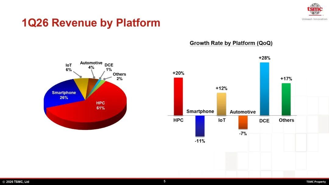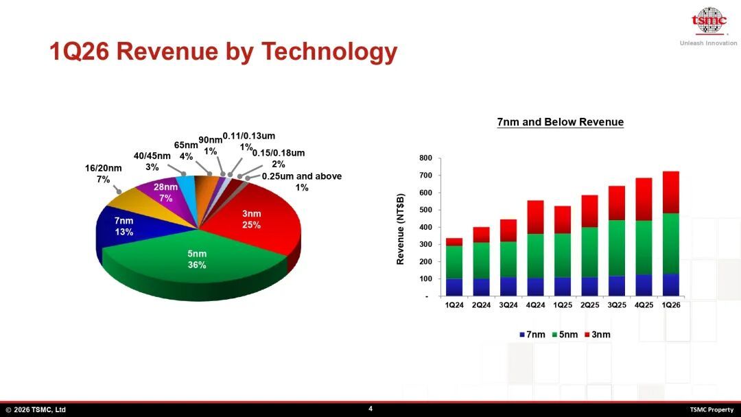 若以制程占比观察,首季3纳米占25%、5纳米占36%、7纳米占13%,合计先进制程(7纳米及以下)占74%,显示AI/高速运算需求仍持续推升产品组合朝先进节点移动。